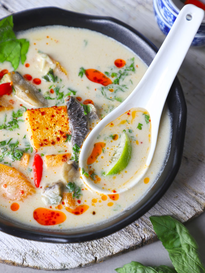 Traditionally, this Thai soup is made with chicken (gai). I am sharing a plant-based, vegan version of Thai Coconut Soup without compromising the flavours.