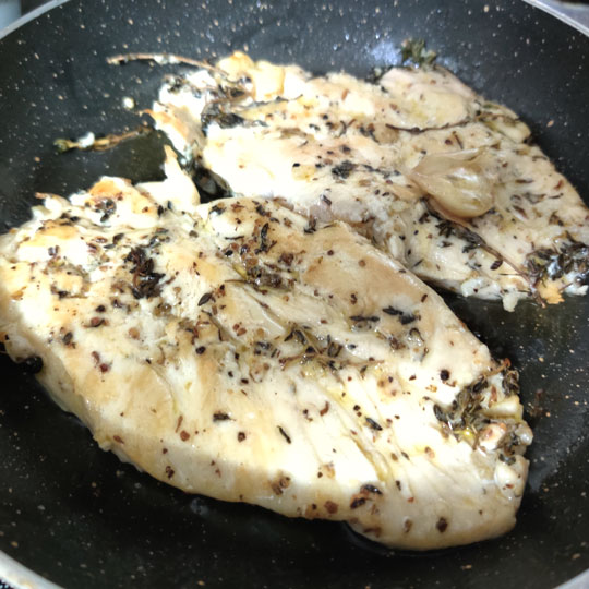 - Next, marinate chicken breast with olive oil, crushed garlic, fresh thyme, salt, pepper, and chilli flakes. Rub the herbs and spices all over the chicken breast. Keep in the fridge until ready to grill. I do this on Sunday night. And the marinated chicken is good to use throughout the week.